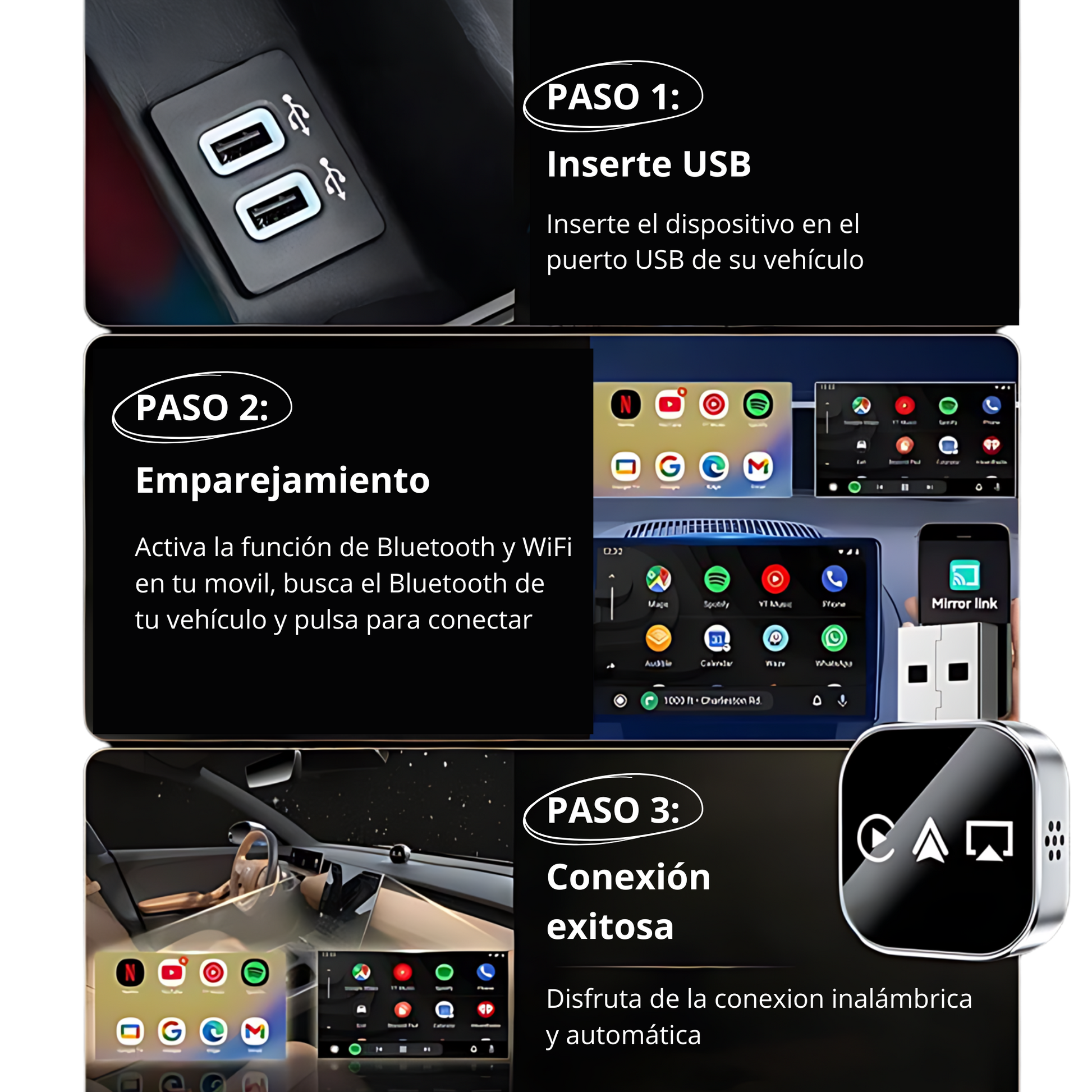 Transforma tu coche en una experiencia moderna, inteligente y completamente inalámbrica. Con el Adaptador Inalámbrico CarPlay y Android Auto, cada trayecto se convierte en una conexión fluida entre tú y tu vehículo.